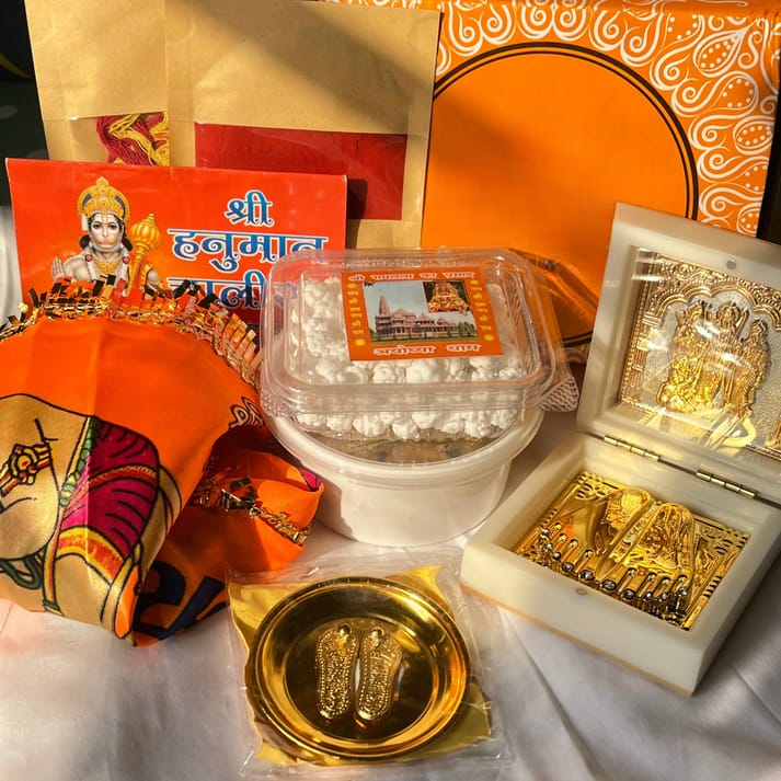 Bring the divine grace of Ayodhya into your home with our Ayodhya Prasad Box. Each item in this sacred collection is carefully selected to allow you to feel the presence and blessings of Shri Ram, Mata Sita, Lakshman Ji, and Hanuman Ji, wherever you are.